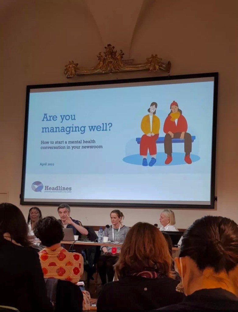 Later that afternoon we attended the session, “How to Start a Mental Health Conversation in Your Newsroom.” The panel was composed by John Crowley, Eliza Anyangwe, Hannah Storm, and Sarah Ward-Lilley. These talented journalists all found themselves leading a group of fellow journalists or a newsroom at some point in their careers and they asked themselves questions about whether they were doing enough for their colleagues’ mental health. Crowley and Storm founded the Headlines network, which promotes mental health in the media world. Former managing editor at BBC News Sarah Ward-Lilley, recognized that the conversation about mental health in the newsrooms started around the 2000s when awareness started appearing specifically around trauma and PTSD. COVID-19 only pushed forward the agenda since, “it brought us in our bedrooms and kitchens” forcing us to know each other better.