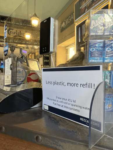 Show a JCU ID to the barista, request either still or sparkling water, and give a bottle to be filled up behind the counter by the staff