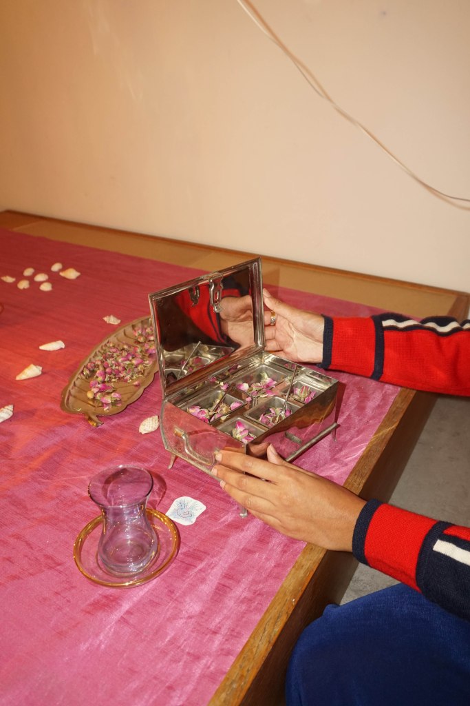 Rome, Oct. 1, 2023 – Mana I., 24, prepares rose bud tea for her guests from a casket her grandma gave her in Pakistan.