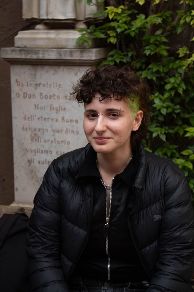 Rome: Via della Lungara, Feb. 21, 2024. JCU student Levka Starkova, 20, stands on the rooftop terrace of the Guarini Campus. “To me, Pride means being comfortable with who l am and accepting myself,” Starkova said. “Being femme presenting and it being my assigned sex at birth, it took me some years to feel comfortable with what nonbinary meant to me. I can present however the f** I want to, and nobody can take that away from me.”
