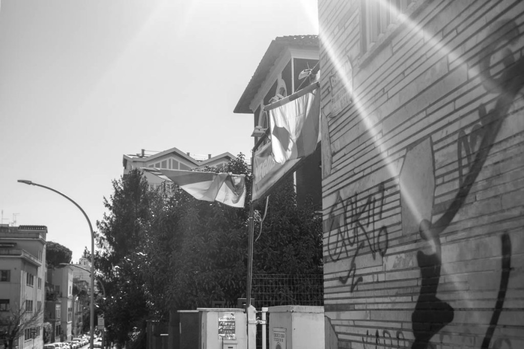 Rome: Tuscolano Nord, Feb. 21, 2024. Two rainbow flags hang above the entrance of a driveway on Via Portoferraio. The rainbow flag is the official symbol of LGBTQ+ pride and was created by artist Gilbert Baker in 1978.