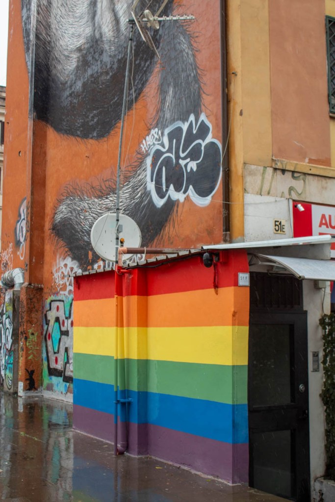 Rome: Via Galvani. March 26, 2024. A view of the #RainboWall, an LGBTQ+ Club supported by the Gay Center. The Gay Center is an association providing services and office space for organizations supporting the rights, health and well-being and culture of LGBTQ+ Italians.