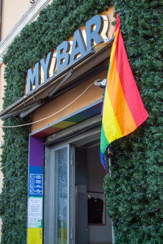 Rome: Via di San Giovanni in Laterano. April 8, 2024. The bar, ‘My Bar’, sits right next to ‘Coming Out Roma.’ It is considered an LGBTQ+ inclusive space.