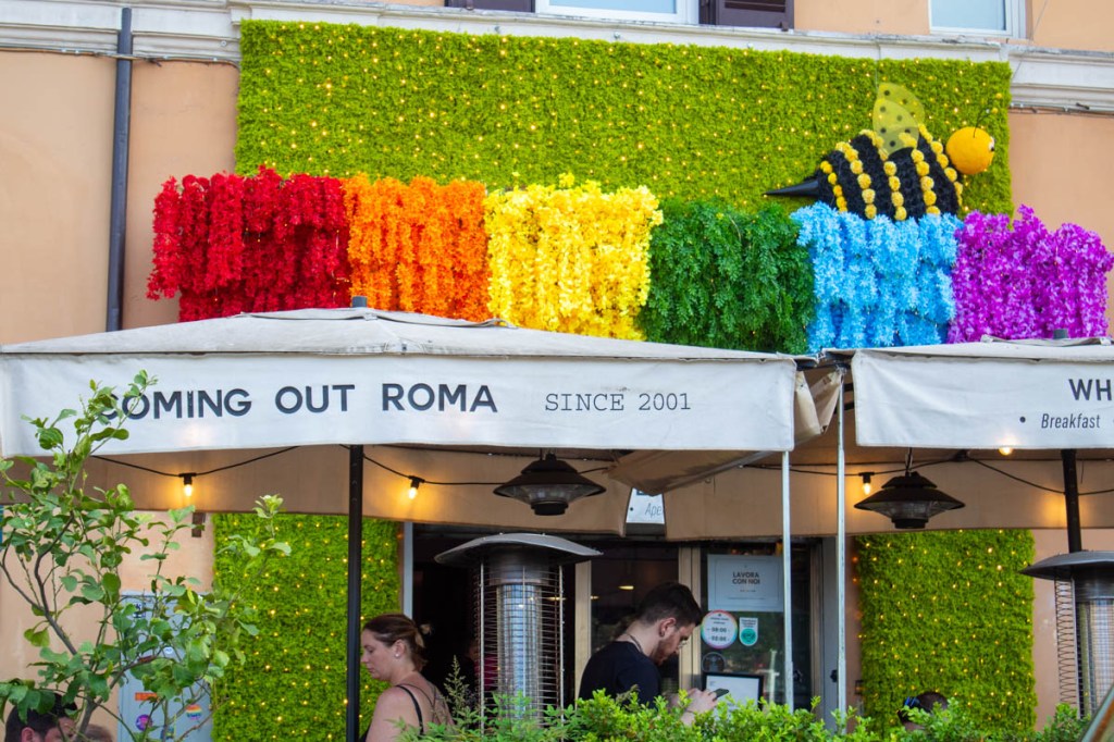 Rome: Via di San Giovanni in Laterano. April 8, 2024. The front of the gay bar, ‘Coming Out Roma,’ is decorated with flowers in the color of the rainbow. The bar is on a road that was officially designated as “Gay Street” in 2007.