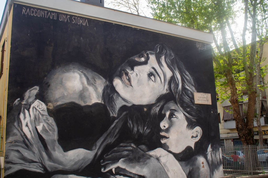 Rome: Via Giuseppe Mezzofanti. April 9, 2024. In Quartiere Primavalle the art piece “Tell Me a Story,” painted by Luis Gomez remains from the street art proiect “Muracci Nostri.” This painting depicts two partially unclothed women intimately embracing each other.