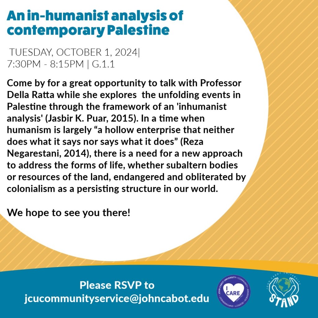 Communications professor and independent researcher, Donatella Della Ratta, was invited by STAND on Oct. 1st to speak to members of the student body and talk about the harsh reality of Gaza from an “Inhumanist Analyst of Contemporary Palestine.” This was an informative and commemorative lecture commenting on how there is no longer a humanitarian perspective after Gaza, while intertwining the teachings of cultural communication philosopher Theodor Adorno and prominent Palestinian-American voice Hala Ayan, and more. Professor Della Ratta presented a critique of humanitarianism, arguing that expressing sympathy or offering aid is no longer sufficient.